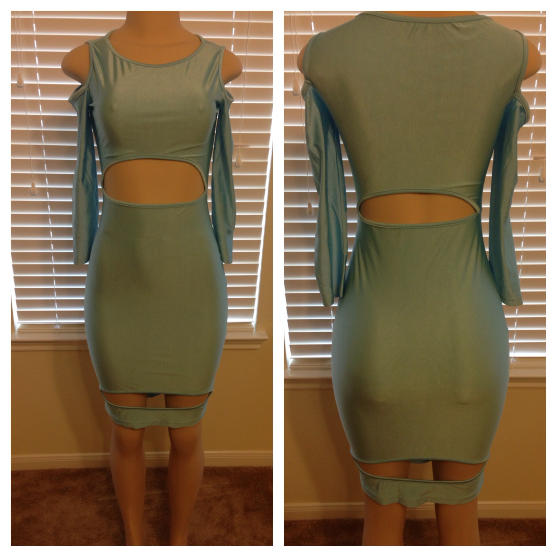 Polyester Blend Spandex , cut detail in front, back, shoulders, and around legs. Form fitting, above the knee mini.