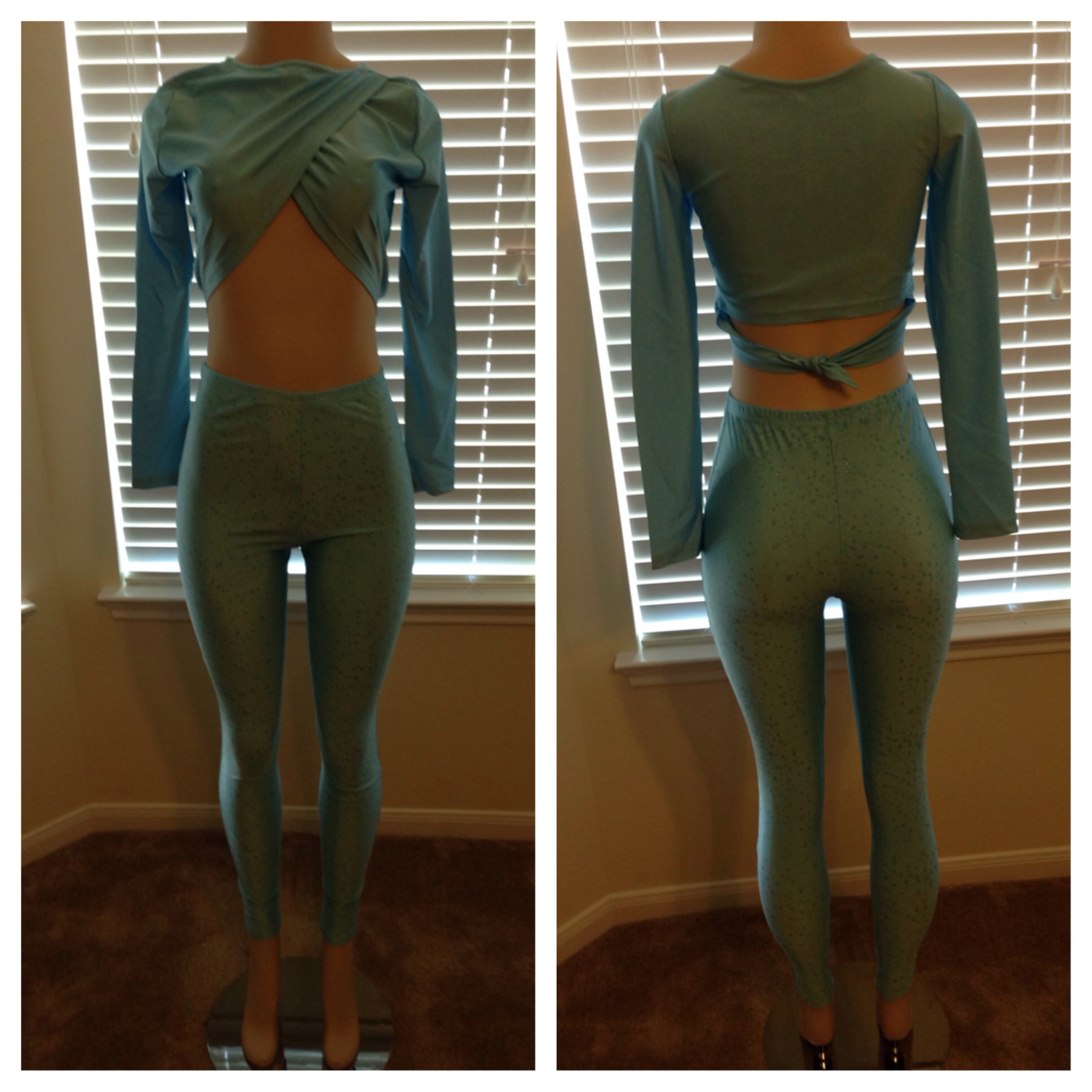 Polyester Blend Spandex. Stretchy two piece pants set, open back, long sleeve, form fitting.