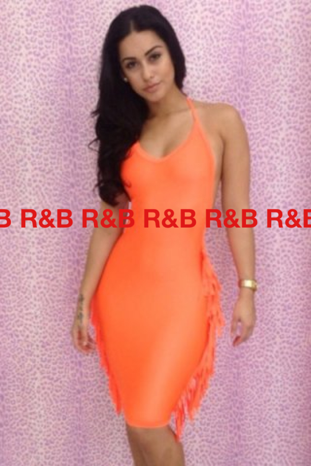 Spandex/ Polyester Blend Orange halter top, low back, fringed side bodycon. Hand wash/dry clean