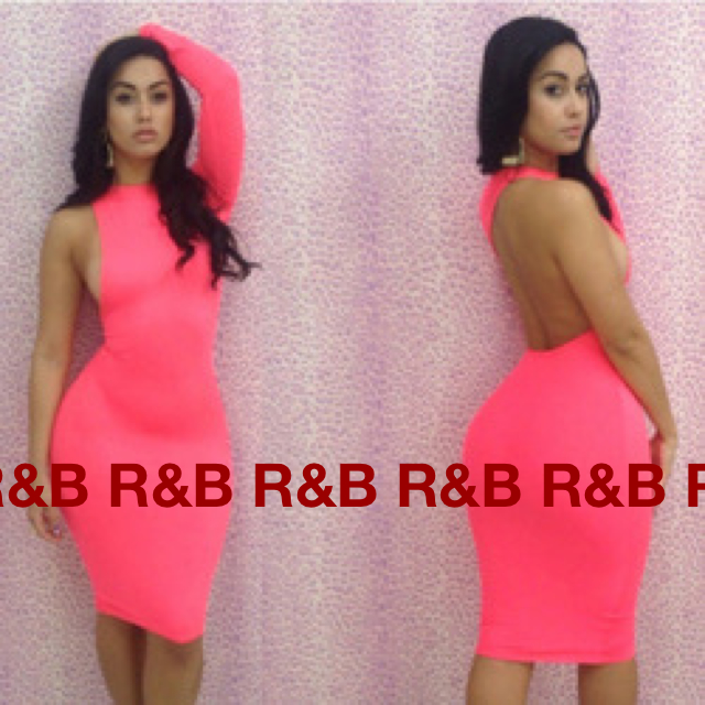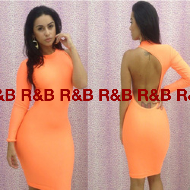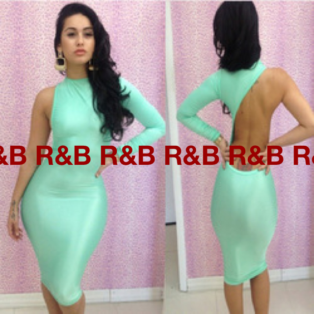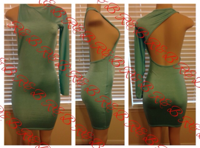 Polyester Blend Spandex. One arm, cut out back, form fitting dress. Available in Mint, Orange, and Pink
