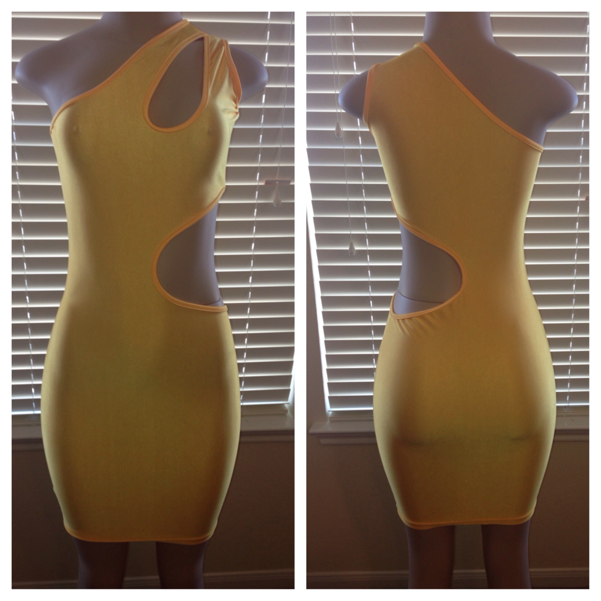 Polyester Blend Spandex , cut detail in front, curve cut in back, sleeveless, form fitting, snitched to the knee.