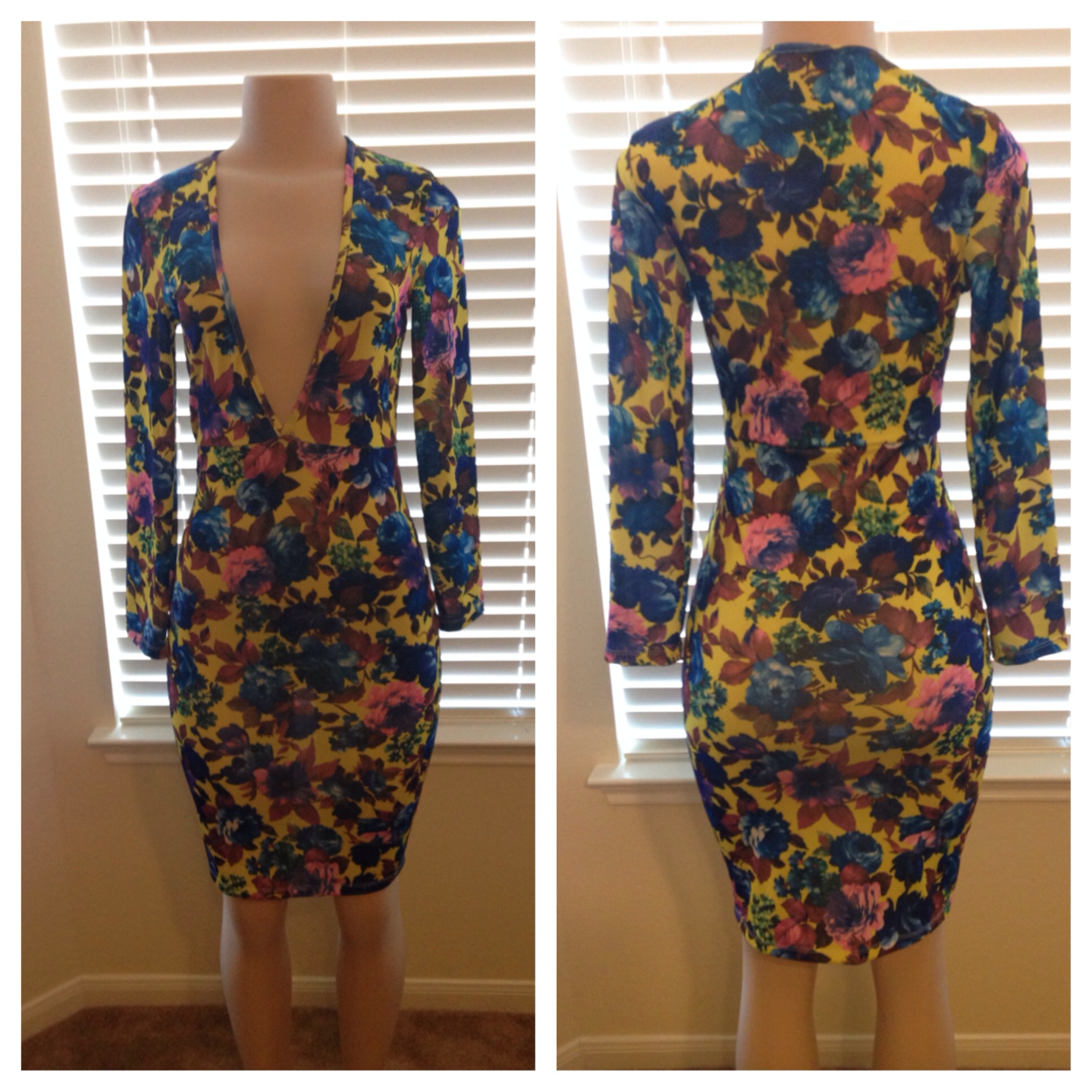 Polyester Blend Spandex , low V cut front, Open low back, long sleeve, form fitting, snitched to the knee.
