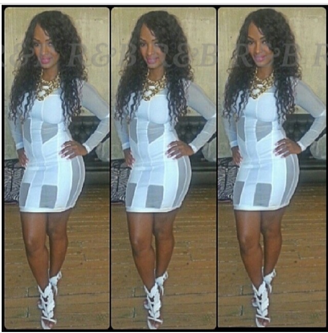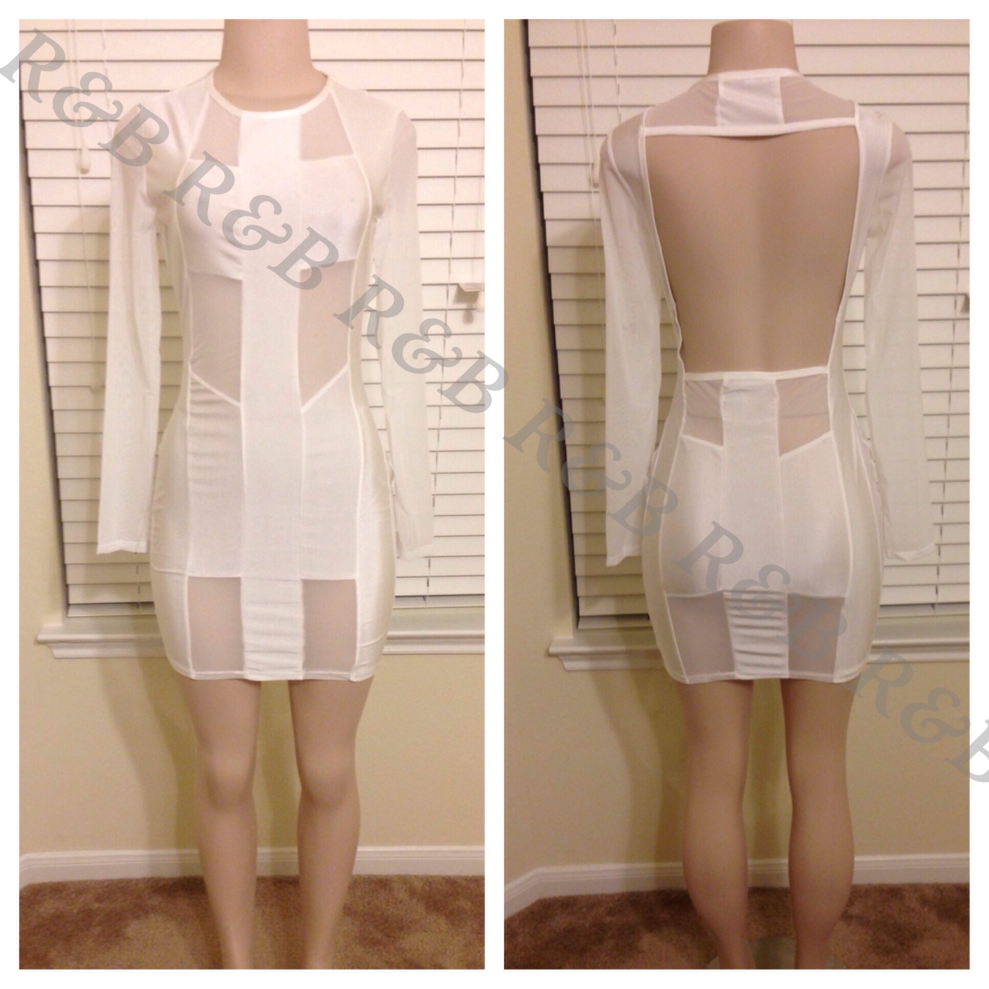 Polyester Blend Spandex. sheer cut out detail, opened back, long sleeve, form fitting, snitched to the knee.