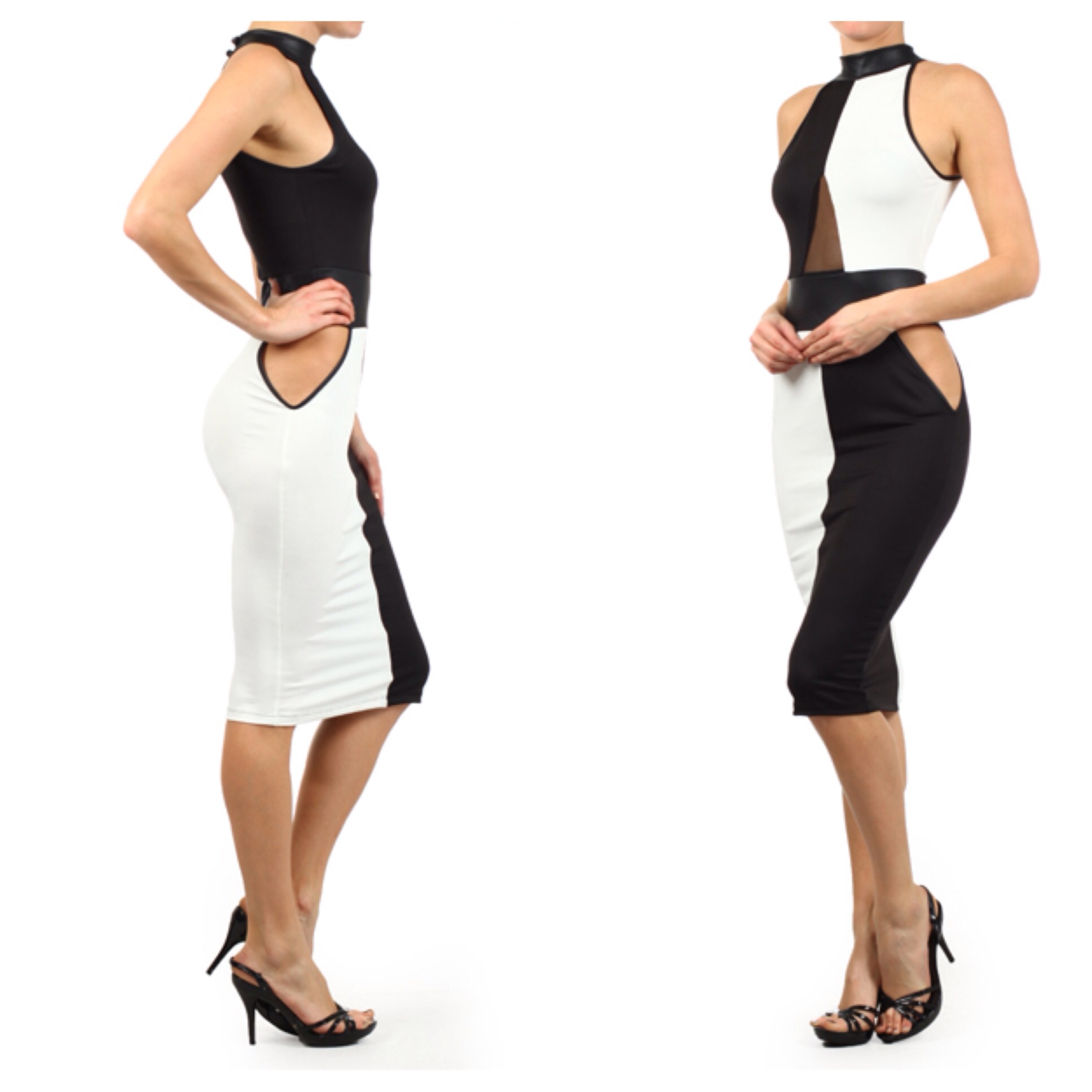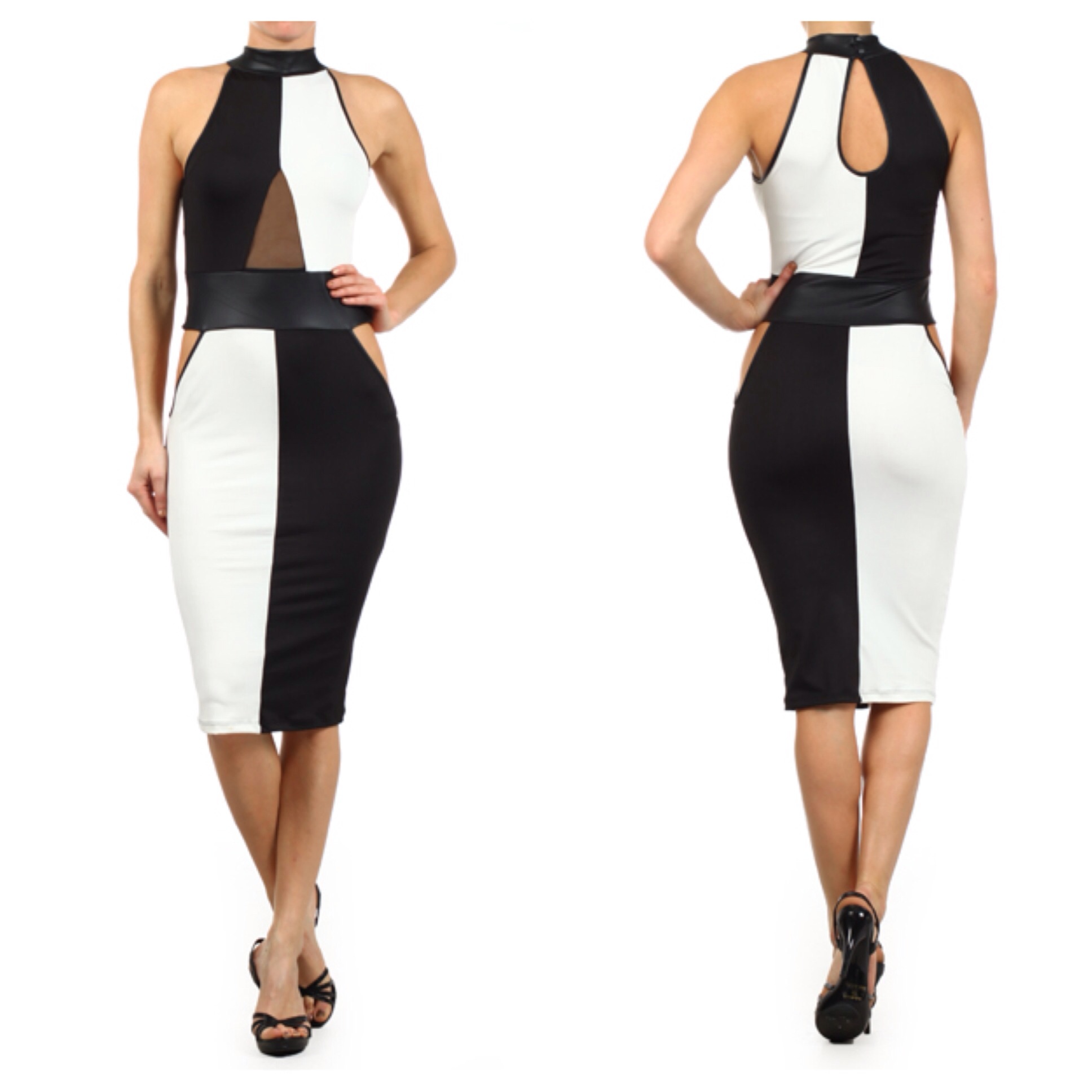 Description: Color block, duo fabric dress with a mesh inset on midriff and keyhole button closure on back. Dress features cutouts on sides of skirt.
